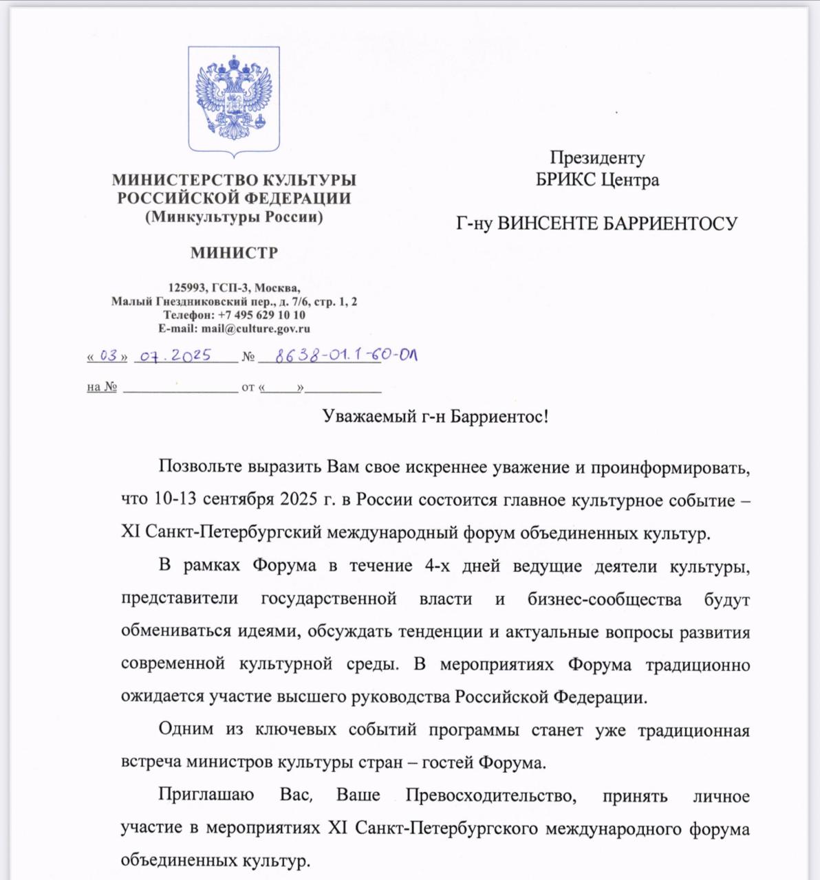 Президент БРИКС Центра Висенте Барриентос по приглашению Министра Культуры России в очередной раз примет участие в XI Форуме Объединённых Культур 11-13 сентября 2025 в Санкт-Петербурге.